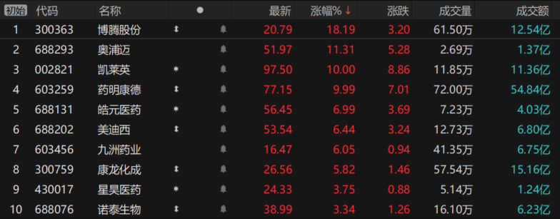 7月11日讯今日上午,CXO概念股集体发力,药明康德、凯莱英涨停,博腾股份涨超18%,奥浦迈涨超11%,美迪西、皓元医药等多股跟涨。