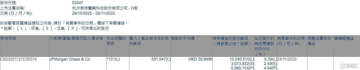 格隆汇11月28日丨根据联交所最新权益披露资料显示,2025年11月24日,泰格医药(03347.HK)获JPMorgan Chase & Co.以每股均价38.9488港元增持好仓50.15万股,涉资约1953.5万港元。