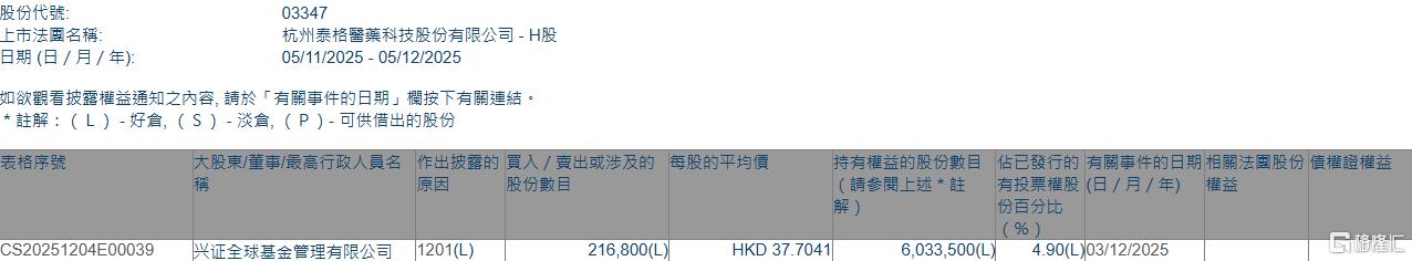 格隆汇12月5日丨根据联交所最新权益披露资料显示,2025年12月3日,泰格医药(03347.HK)遭兴证全球基金管理有限公司在场内以每股均价37.7041港元减持21.68万股,涉资约817.42万港元。