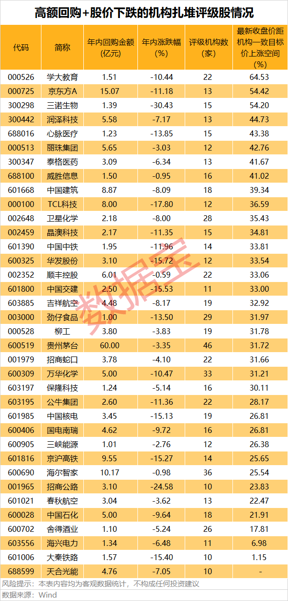 数据显示,年内回购超过1亿元的个股中,有36股的股价逆市下跌且评级机构数在10家以上。