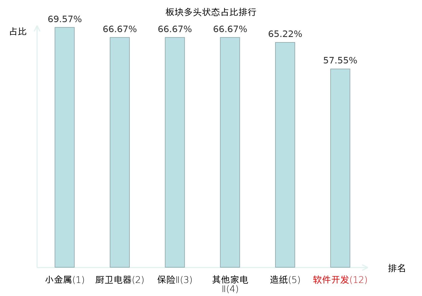全市场所有行业板块中主力多头状态占比排名中,小金属板块位居第一。林业Ⅱ板块名次提升最快,较昨日上升86位。