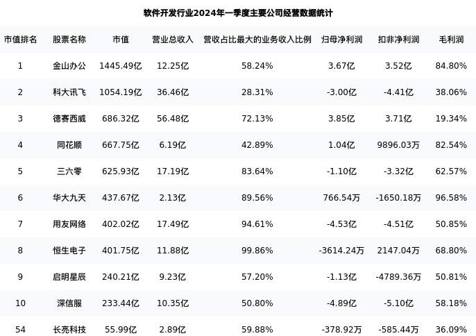 长亮科技最新报告期数据为一季度,下表汇总了软件开发行业内市值靠前的公司一季度主要经营数据
