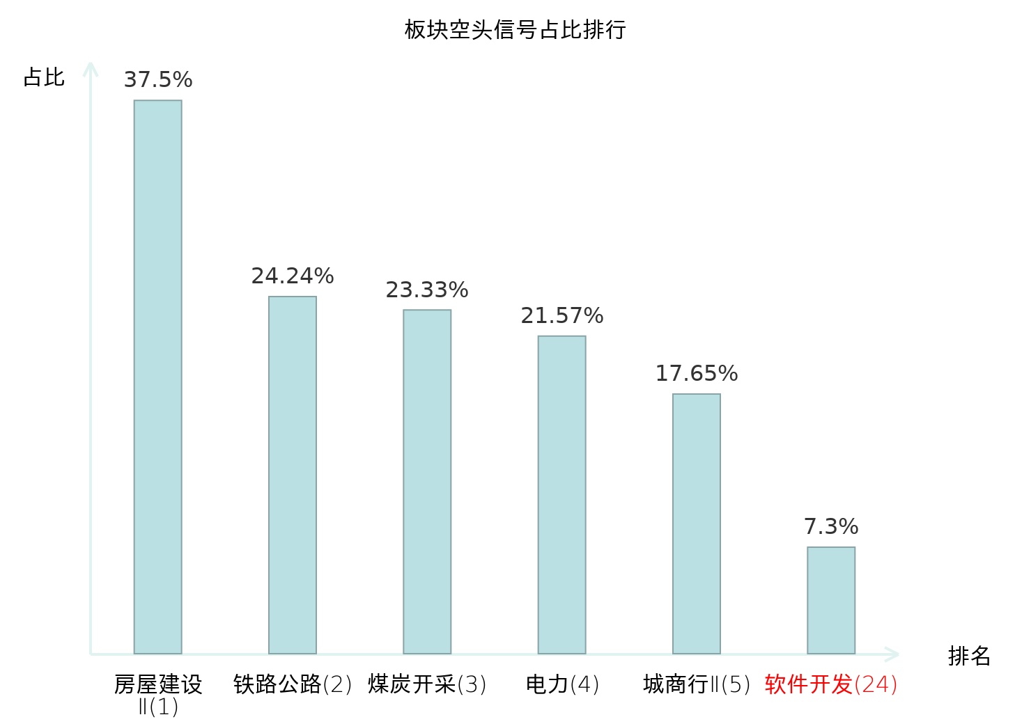 全市场所有行业板块中主力空头信号占比排名中,房屋建设Ⅱ板块位居第一。煤炭开采板块名次提升最快,较昨日上升117位。