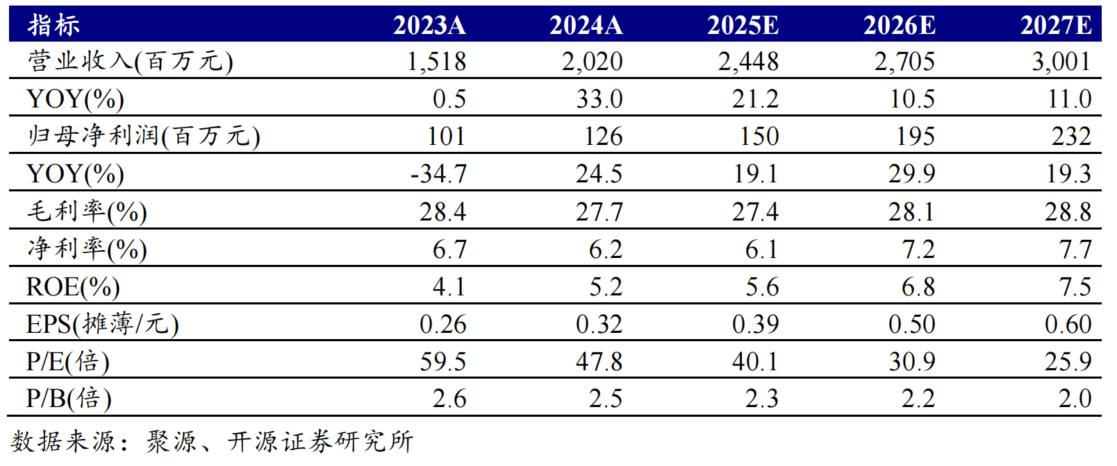 3)考虑到公司新能源业务盈利能力仍有待提升,预计2025/2026/2027年归母净利润1.50/1.95/2.32亿元,当前股价对应PE为40.1/30.9/25.9倍,看好公司新能源业务板块长期成长性,维持“买入”评级。