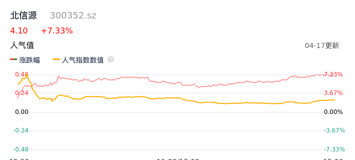 04月17日,北信源收报4.10,股价涨幅7.33%,成交金额1.00亿元,换手率2.04%。