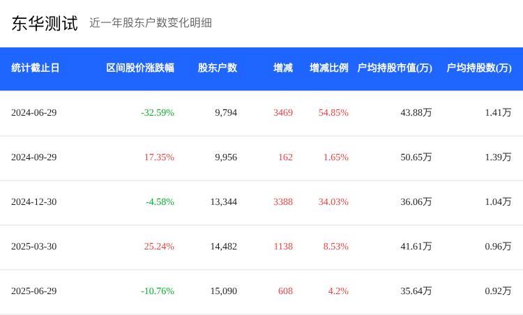 东华测试(300354)在2025年6月30日的股东户数为1.51万,较上期环比增加了4.2%。户均持股数量为35.64万股,较上期环比下降了14.36%,户均持股市值则从上期的40.84万元下降至35.64万元,降幅为14.36%。这表明尽管股东户数有所增加,但平均每户的持股量和持股市值均有所减少,反映出股东结构分散度的增加。