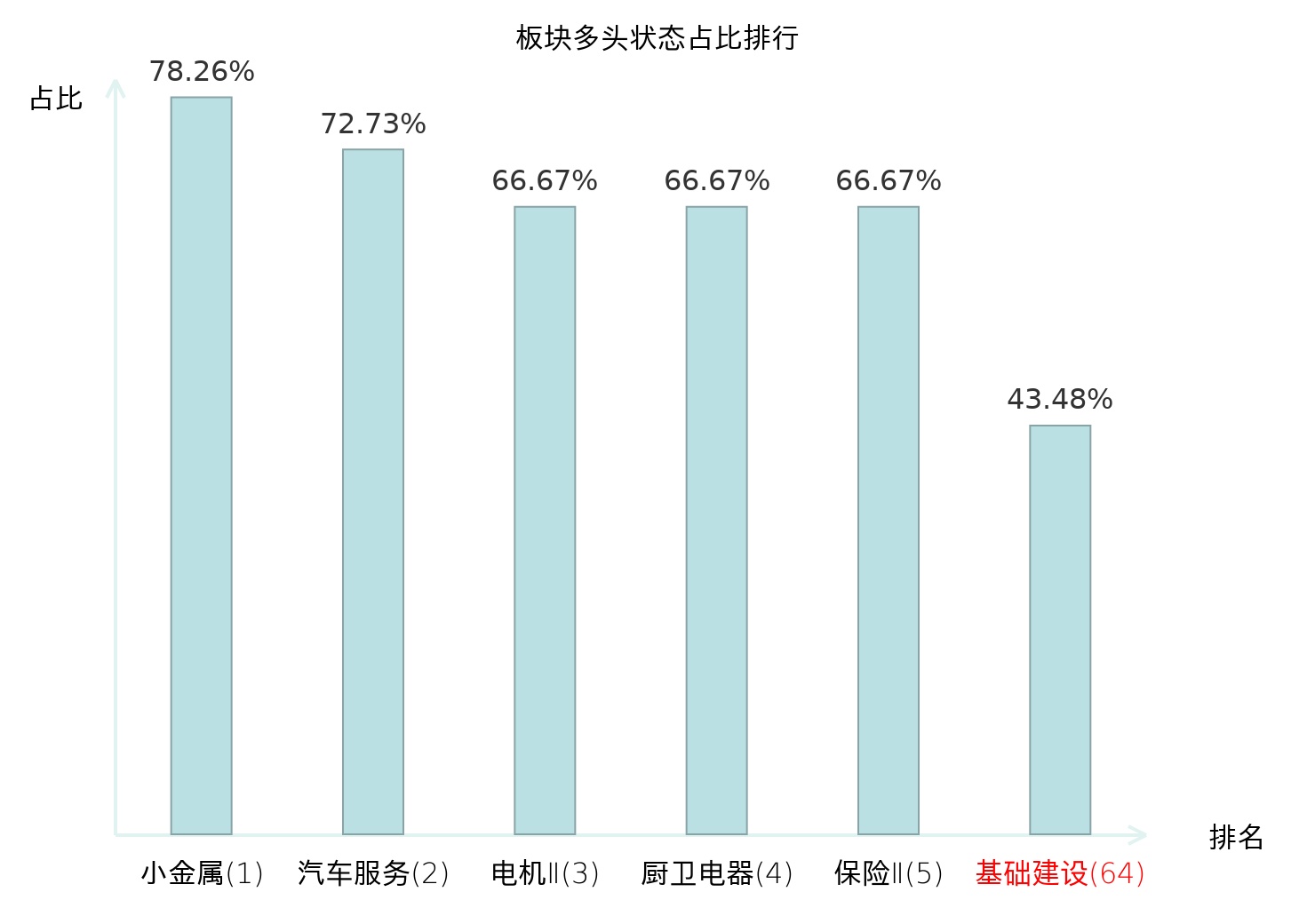 全市场所有行业板块中主力多头状态占比排名中,小金属板块位居第一。农业综合Ⅱ板块名次提升最快,较昨日上升88位。