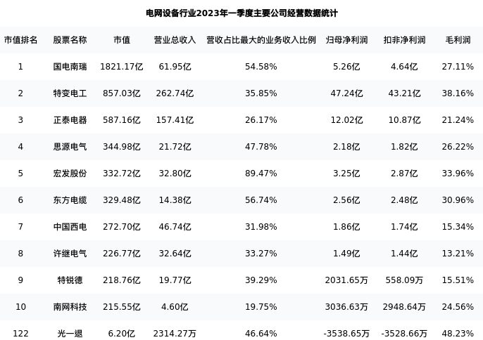光一退最新报告期数据为一季度,下表汇总了电网设备行业内市值靠前的公司一季度主要经营数据