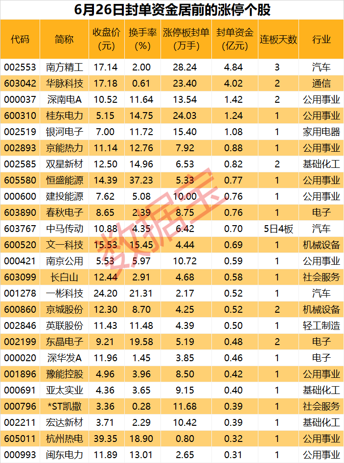 以封单金额计算,5股封单金额超亿元,其中南方精工、华脉科技、深南电A封单金额居前,分别为4.84亿元、4.02亿元、1.42亿元。