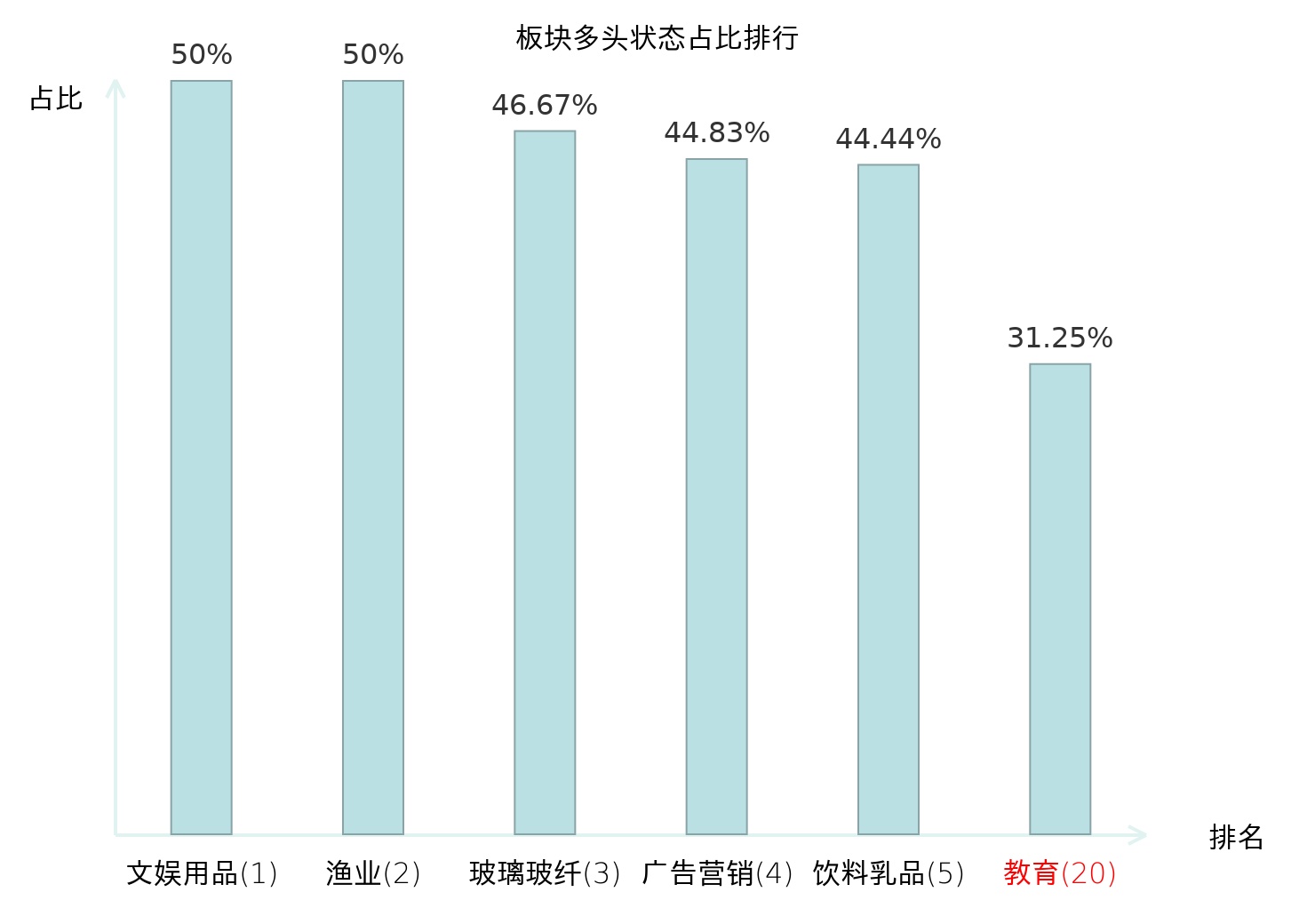 全市场所有行业板块中主力多头状态占比排名中,文娱用品板块位居第一。饮料乳品板块名次提升最快,较昨日上升59位。