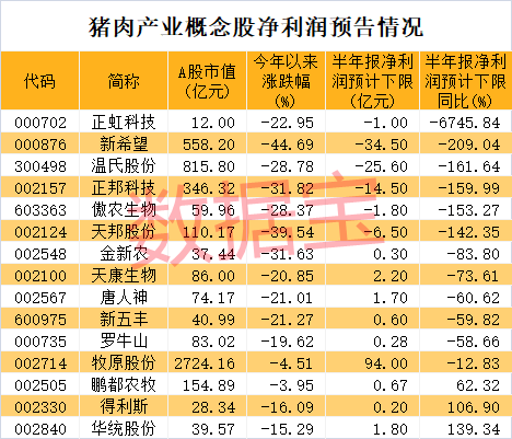 从半年报预告情况来看,猪肉价格下跌对上市公司的业绩影响已有显现。数据显示,已经披露业绩数据的15家猪肉产业概念股中,有12家净利润为预亏或预减状态,占比八成。新希望、温氏股份、正邦科技等3家养殖大户净利润均预亏10亿元以上,其中温氏股份净利润预亏22.6亿元至25.6亿元。整个板块的股价走势也不尽人意,年内10只概念股累计跌幅超20%,其中养殖龙头新希望跌幅最大,该股累计下跌44.69%。