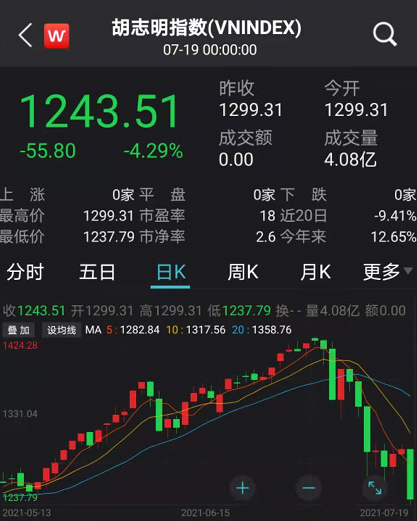 越南股市今日大跌4.29%,创两个月新低,该国首都河内封城。今年前7个月越南股市在全球市场中一枝独秀,期间胡志明指数大涨28.37%。7月2日,胡志明指数创下历史新高,但之后开始大幅调整,迄今累计回撤12.68%。