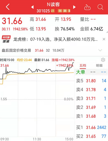 拥有众多IP的读客文化今日正式登陆创业板,开盘就大涨800%,早盘不到半小时经历2次临时停牌。尾盘阶段该股再次拉升,收盘涨幅扩大至1943%,A股市值升至126.64亿元。证券时报·数据宝统计显示,读客文化上市后首日收盘涨幅创下创业板历史上最高纪录。