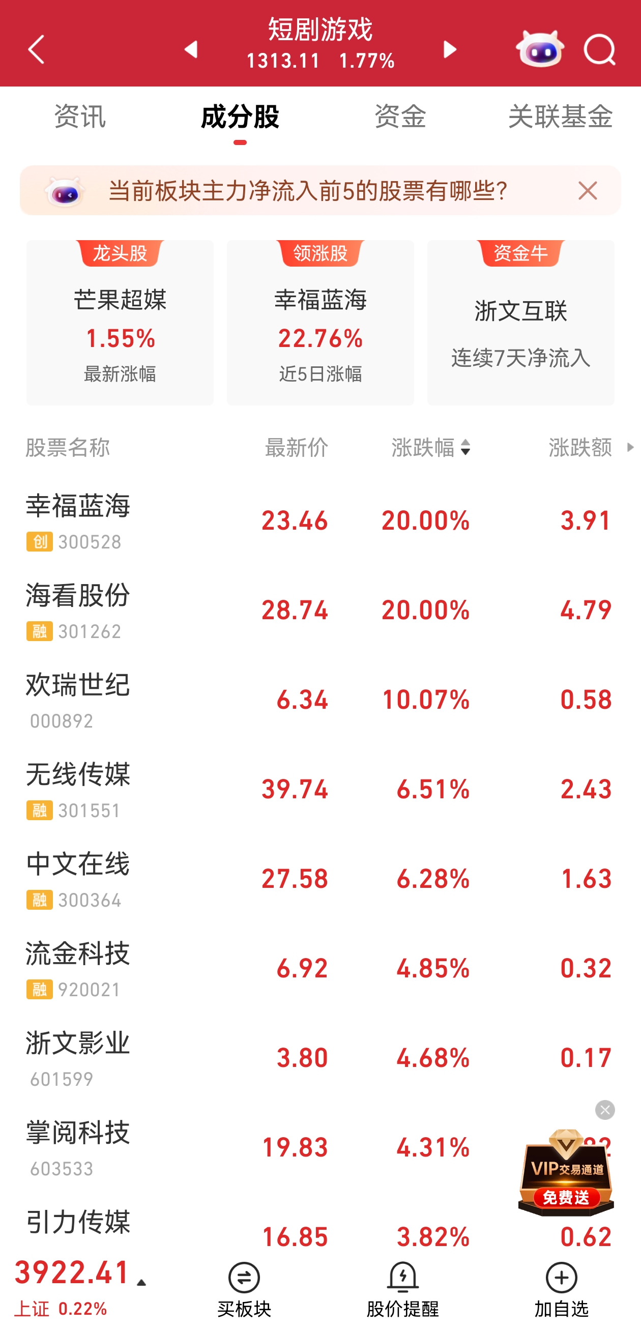 今日,短剧游戏板块走强。幸福蓝海、海看股份“20CM”涨停,欢瑞世纪涨停,无线传媒、中文在线等跟涨。