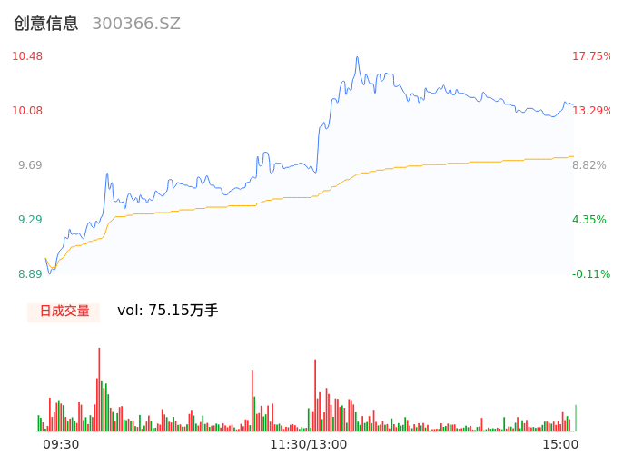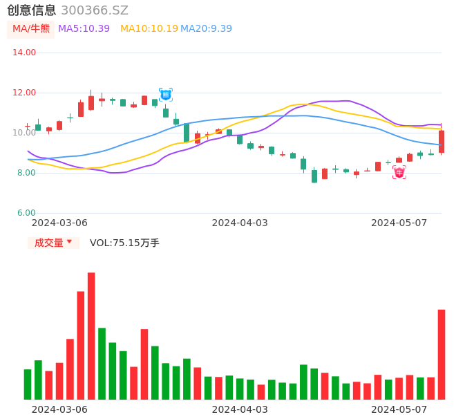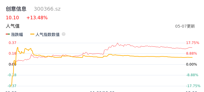 05月07日,创意信息收报10.10,股价涨幅13.48%,成交金额7.33亿元,换手率14.76%。