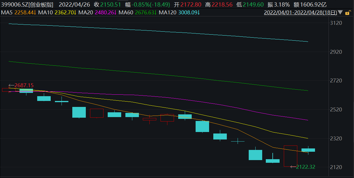 创业板指期间整体跌12.8%。最高点位为2687.15点,最低点位为2122.32点。