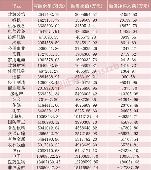从行业板块情况来看,数据显示,截至9月9日,本周前3个交易日,申万一级28个行业中,有12个行业融资余额增加,融资余额净买入金额前三的行业分别为建筑装饰、钢铁、机械设备行业,净买入金额分别为3.11亿元、2.31亿元、1.87亿元;融资余额净卖出居前的三个行业分别为非银金融、医药生物、电子行业,净卖出金额分别为24.79亿元、18.01亿元、10.05亿元。