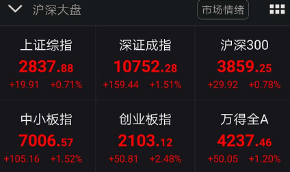 截至当日午盘收盘,沪指涨0.71%;深成指涨1.51%;创业板指涨2.48%。