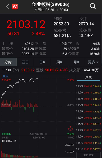 5月26日开盘,创业板开盘高开高走,指数快速上攻,临近午盘,创业板指大涨超2%以上。其中超680家上市公司翻红。