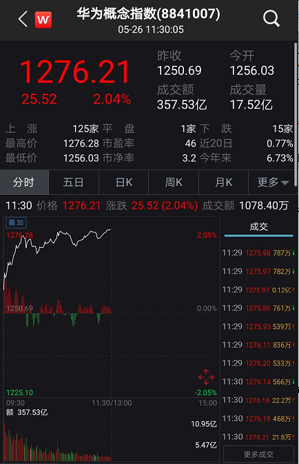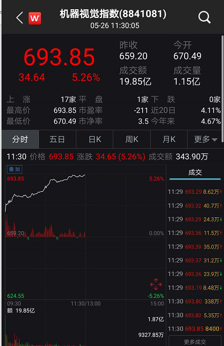 在华为新品发布后,概念股也闻风而动。5月26日上午,华为概念股大涨超2%,市值一度猛飙超900亿,同时机器视觉指数更是大涨超5%,多只概念股涨停,最猛涨幅超20%,成为领涨两市的热门题材。