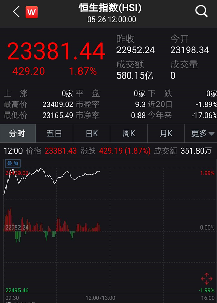 同时,港股市场同步大涨,恒指半日狂拉400点,新经济板块集体飘红,热门股美团点评盘中大涨超8%。