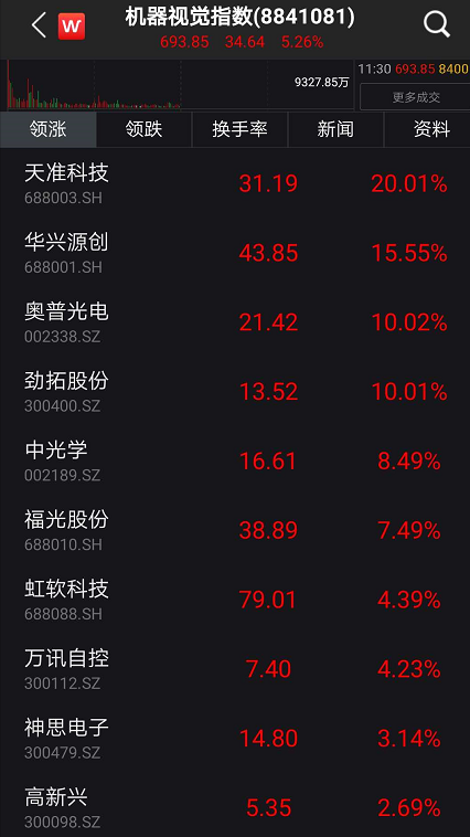 同时,机器视觉指数早盘大涨超5%,板块内天淮科技、华兴源创、奥普光电、劲拓股份强势涨停。其中天淮科技涨超20%。