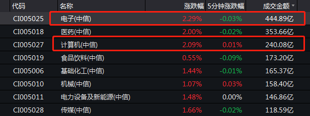 从行业板块来看,短短半日,电子行业板块成交金额就突破400亿,计算机板块成交金额突破240亿。