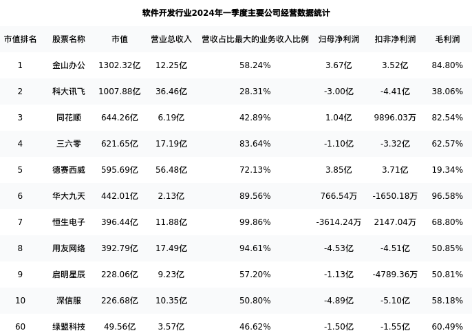 绿盟科技最新报告期数据为一季度,下表汇总了软件开发行业内市值靠前的公司一季度主要经营数据