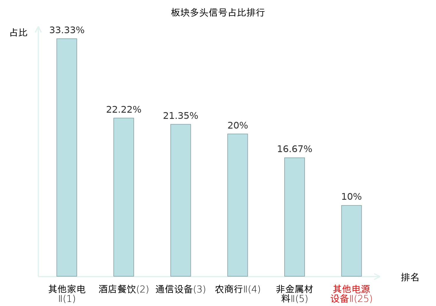 全市场所有行业板块中主力多头信号占比排名中,其他家电Ⅱ板块位居第一。其他家电Ⅱ板块名次提升最快,较昨日上升128位。