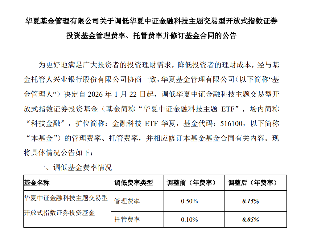 1月21日,华夏基金又一热门赛道ETF宣布降费,金融科技ETF(516100)管理费自0.5%降至0.15%,托管费自0.1%降至0.05%,真正做到让利于投资者,本次费率调整后,该产品费率降为赛道最低。