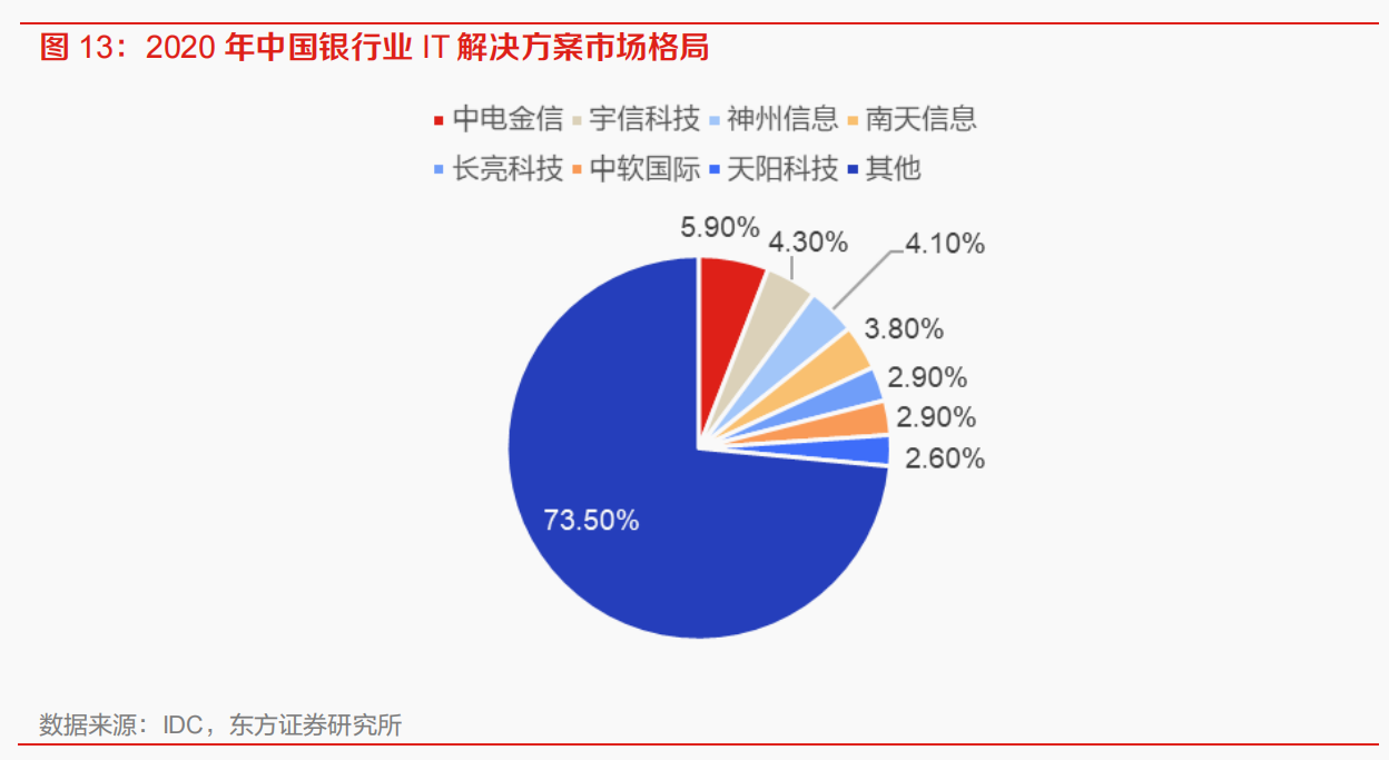 除上述公司外,中国银行IT市场的玩家还有恒生电子、科蓝软件、信雅达、中亦科技、京北方、信安世纪、新晨科技、银信科技、慧博云通、电科数字、润和软件及中国银行、农业银行、工商银行、建设银行、交通银行、招商银行、中信银行、兴业银行、广发银行等头部银行企业。
