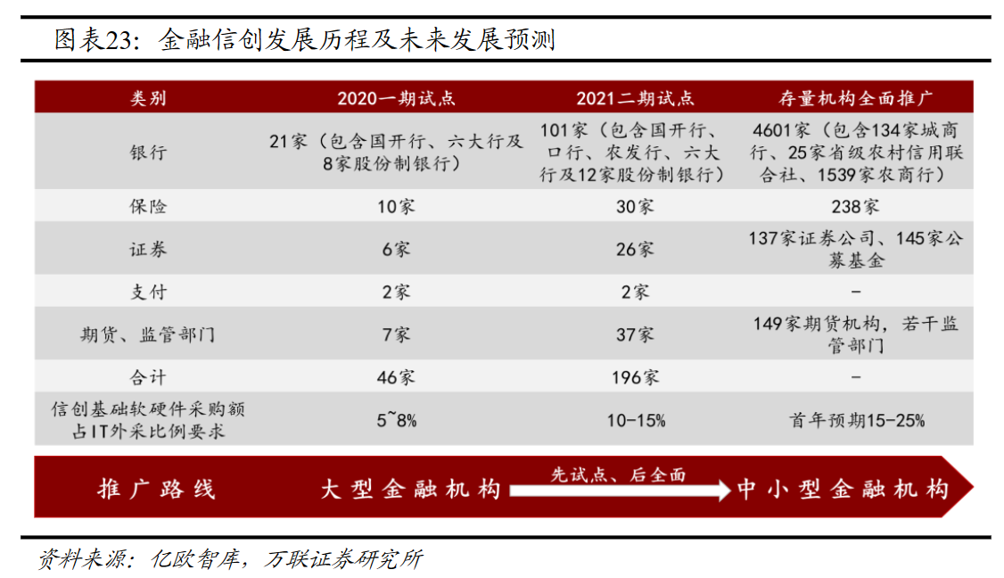 金融行业是信创工程推进的排头兵,是继党政信创之后发展最快的应用领域之一。东方证券张颖在7月5日的研报中表示,2020年和2021年,金融行业信创启动两期试点,覆盖数量分别为46家和196家。目前,金融信创三期试点已收官,按照“先试点,后全面”的技术推广路线,现已进入存量机构全面推广阶段,参与方将扩容至全行业5000余家金融机构,逐渐由大型银行、证券等机构向中小型金融机构渗透。招商证券郑积沙在2月22日的研报中更表示,金融信创实质性推进箭在弦上,未来三年为黄金窗口。