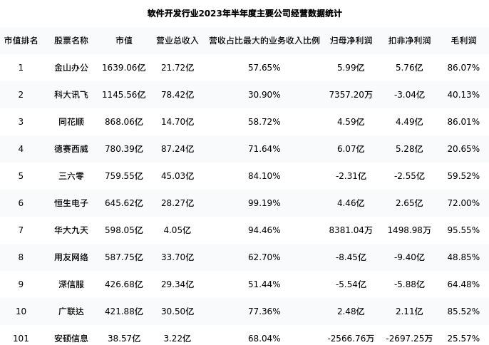 安硕信息最新报告期数据为半年度,下表汇总了软件开发行业内市值靠前的公司半年度主要经营数据