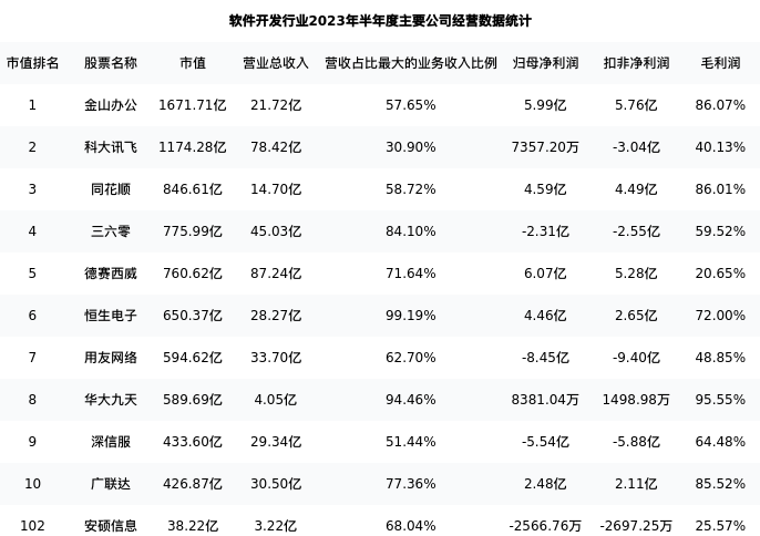 安硕信息最新报告期数据为半年度,下表汇总了软件开发行业内市值靠前的公司半年度主要经营数据
