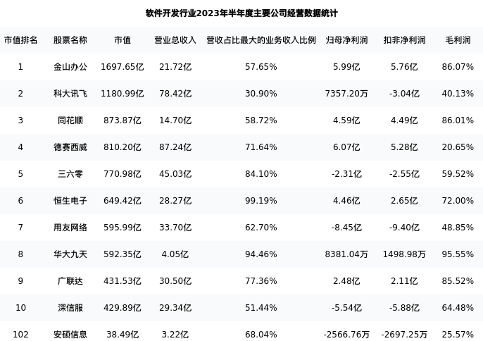 安硕信息最新报告期数据为半年度,下表汇总了软件开发行业内市值靠前的公司半年度主要经营数据