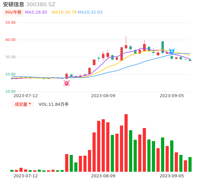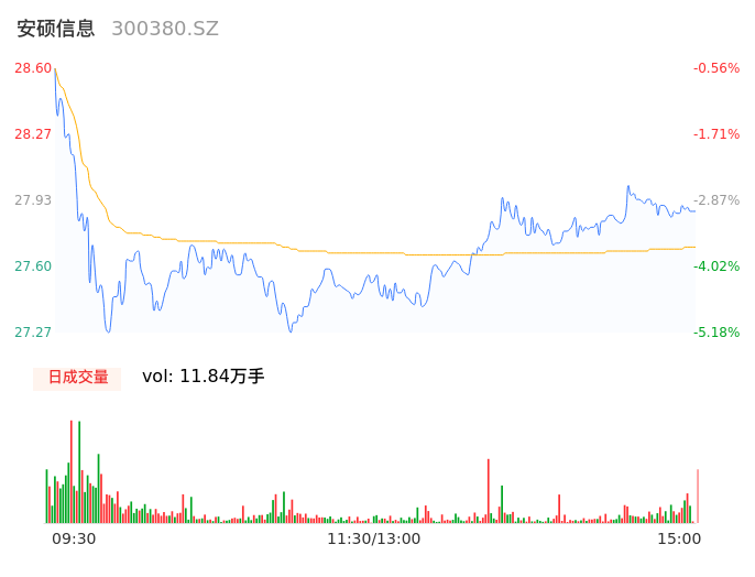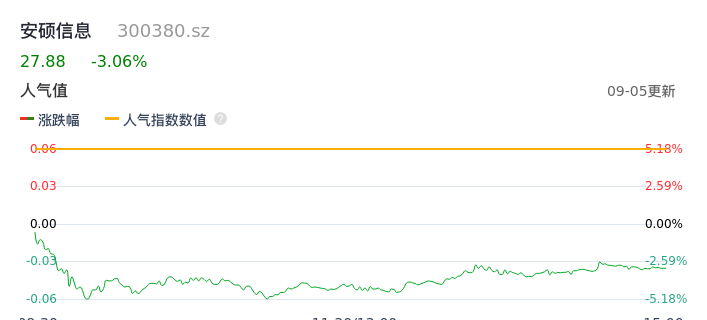 09月05日,安硕信息收报27.88,股价涨幅-3.06%,成交金额3.28亿元,换手率9.50%。