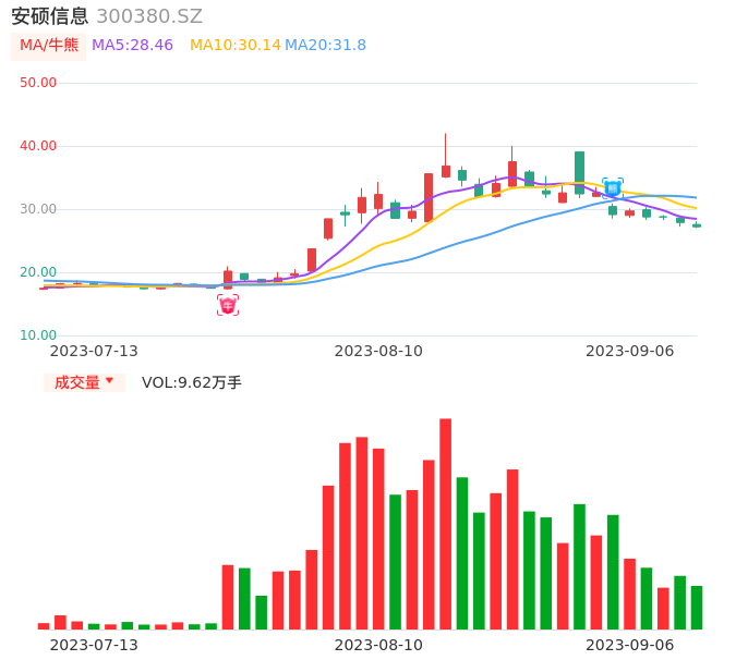 安硕信息在8月30日出现日线级别熊点,股价已经进入下降通道,且60分钟级别也处于熊点信号,短中期持续走弱,建议继续谨慎观望。