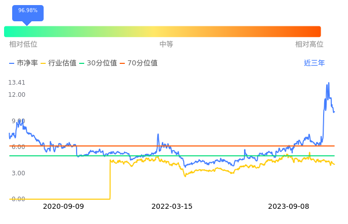 安硕信息当前市净率PB为10.12,在所属的软件开发中,市净率PB排121,前五名分别为中电兴发市净率1.07、天融信市净率1.16、理工能科市净率1.20、天源迪科市净率1.85、高新兴市净率2.09。安硕信息当前市净率PB为10.12,超过近3年96.98%的历史数据。
