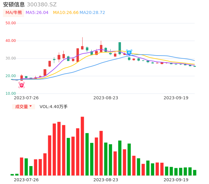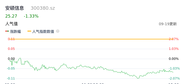 09月19日,安硕信息收报25.27,股价涨幅-1.33%,成交金额1.12亿元,换手率3.53%。