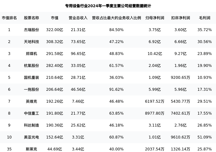 斯莱克最新报告期数据为一季度,下表汇总了专用设备行业内市值靠前的公司一季度主要经营数据