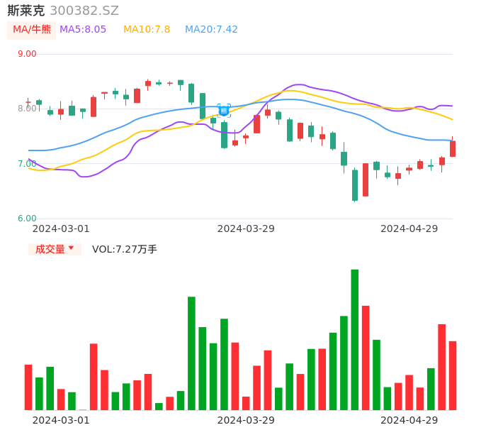 04月29日,斯莱克收报7.41,股价涨幅4.22%,成交金额5359.82万元,换手率1.16%。
