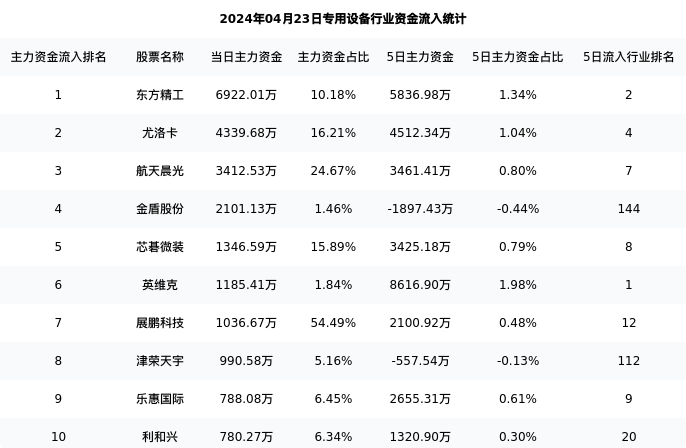 从主力资金流向来看,专用设备行业今日主力资金流入33.84亿元,在所有申万二级行业中排名:130/131。