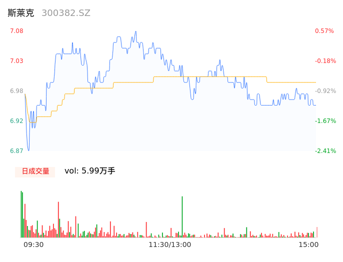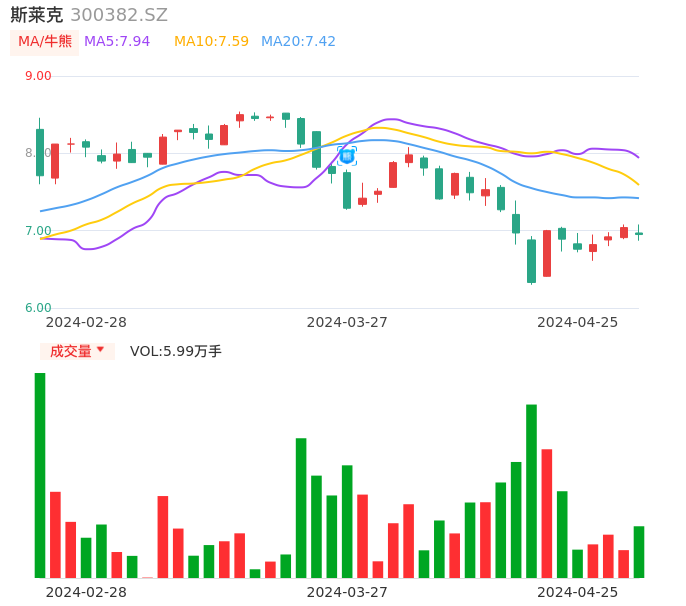 04月25日,斯莱克收报6.95,股价涨幅-1.28%,成交金额4187.42万元,换手率0.95%。