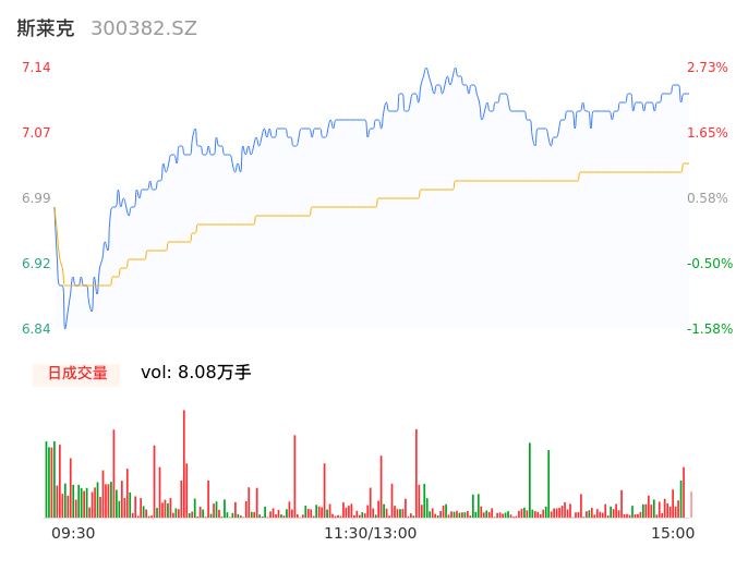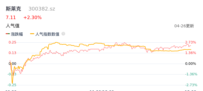 04月26日,斯莱克收报7.11,股价涨幅2.30%,成交金额5674.21万元,换手率1.29%。