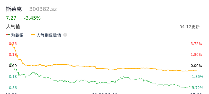 04月12日,斯莱克收报7.27,股价涨幅-3.45%,成交金额5660.40万元,换手率1.22%。