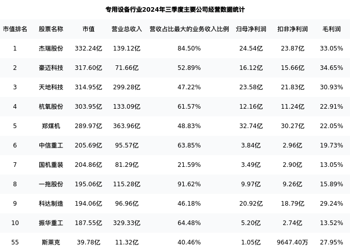 斯莱克最新报告期数据为三季度,下表汇总了专用设备行业内市值靠前的公司三季度主要经营数据