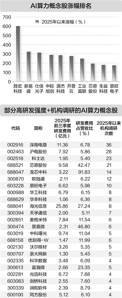 上述这35只研发强度高的概念股中,今年以来机构调研频次最高的是深南电路,累计获调研36次。今年前三季度,公司实现归母净利润23.26亿元,同比增长56.3%。报告期内,公司把握AI算力升级、存储市场结构性增长、汽车电子智能化需求增加的发展机遇,实现了主营业务收入的同比增长。