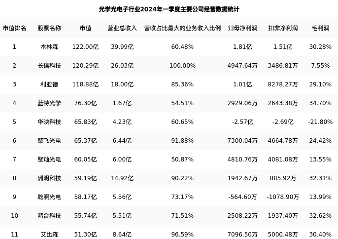 艾比森最新报告期数据为一季度,下表汇总了光学光电子行业内市值靠前的公司一季度主要经营数据