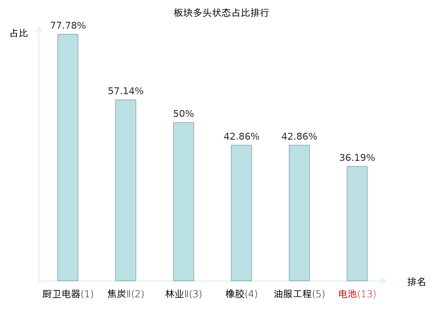 全市场所有行业板块中主力多头状态占比排名中,厨卫电器板块位居第一。影视院线板块名次提升最快,较昨日上升88位。