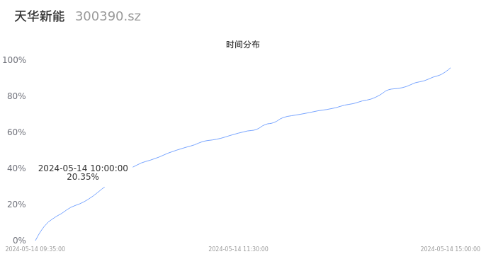 300390天华新能2024年05月14日成交8.41万手,成交金额1.80亿元,相较昨日缩量7206手,换手率1.24%,成交清淡。